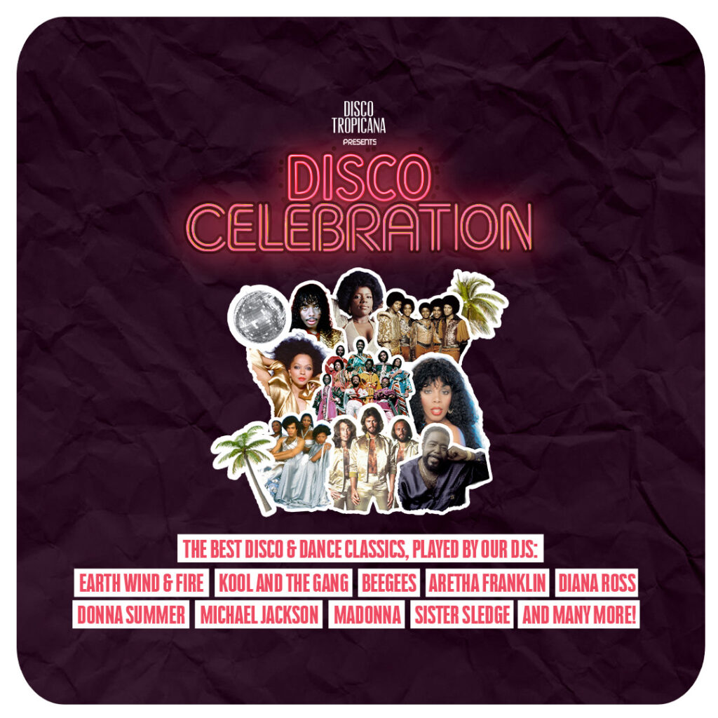 Met A Disco Celebration lanceert Disco Tropicana een nieuw concept: een opzwepende avond vol herkenning, glitter en dansvloerkrakers. Het is een ode aan de grootste disco en dance classics van de jaren zeventig tot nu, met muziek van iconen als Madonna, Earth Wind & Fire, The Bee Gees, Diana Ross en Michael Jackson in de hoofdrol. Dit concept is exclusief te boeken voor popzalen en bedrijfsfeesten via Thunder Agency.
